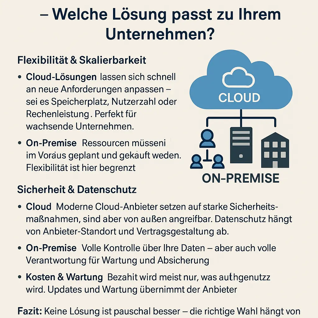 Bei der Wahl der richtigen IT-Infrastruktur stehen Unternehmen oft vor der Frage: Cloud oder On-Premise? Beide Ansätze haben ihre Berechtigung – es kommt auf die Bedürfnisse und Anforderungen Ihres Unternehmens an. Hier die wichtigsten Unterschiede: